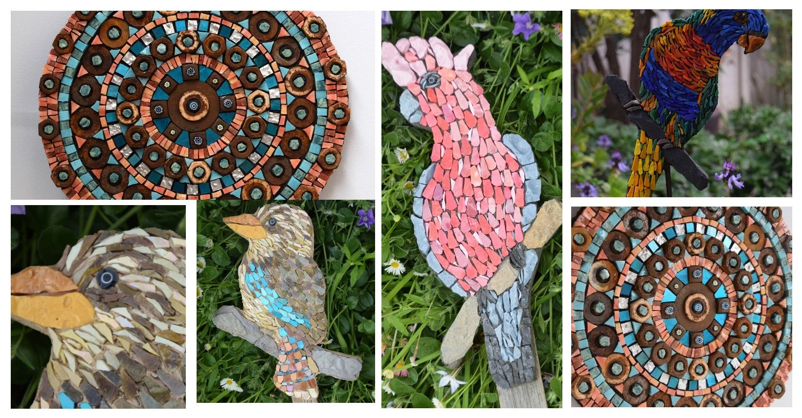 A CHOICE of Mandala or birds will be on offer, but students choosing Mandalas will need to be able to bring extra recycled metal, bolts, washers etc to add to their Mandala. I will be providing some though. Students will recieve a substrate for their mosaic, and also adhesive to use on the day. Students making abird garden stake will also recieve a garden stake to hang their bird. Please let me know which bird you would like to make, when booking.