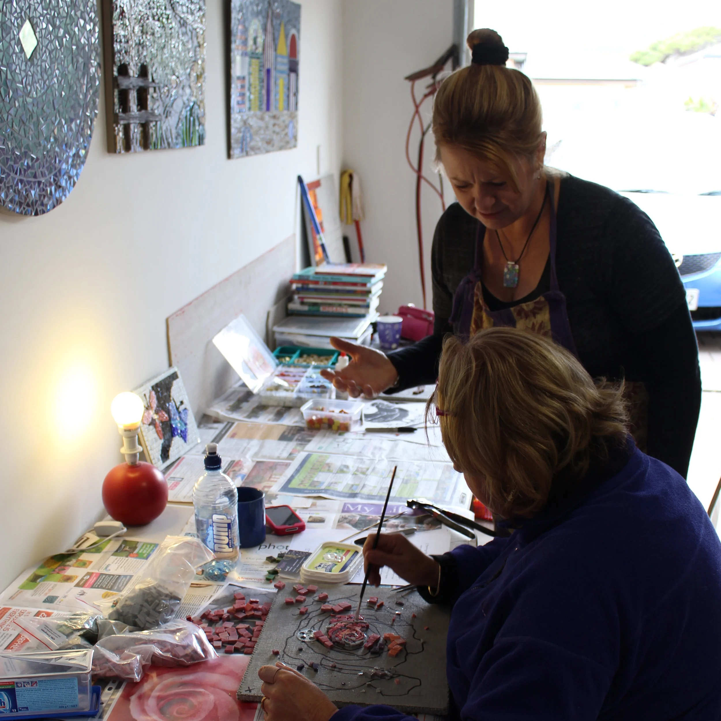 Carol offers a variety of classes on a weekly/fortnightly basis and one or two day workshops throughout the year, for students that are just beginning their mosaic journey, to more advanced students. She teaches at her home studio, on the Fleurieu Peninsula, south of Adelaide, with workshops in Ceramic/Crockery/glass for beginners, to specific Stained Glass Mosaics, 3D, Glass Fusion classes, Smalti and/or driftwood, plus a fortnightly Saturday classes. She also teaches at other venues weekly in Adelaide and the Fleurieu Peninsula. Her classes are well attended, so bookings are essential.